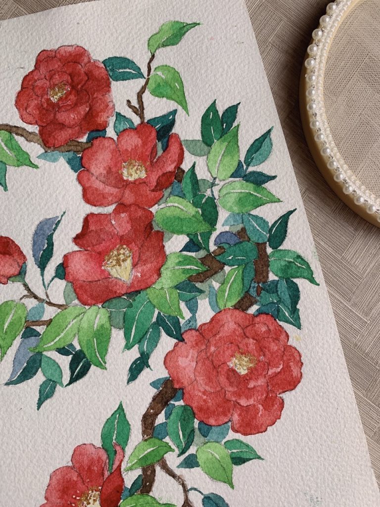 - 學習山茶花和枝葉的型態結構,為了增添更多的藝術元素,加上 Kuretake 吳竹耽美顏彩金屬點綴花蕊,為花朵帶來了閃耀的光澤和細膩的質感。